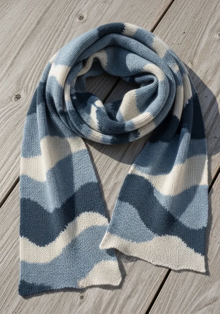 This modern knit scarf stands out with its soft wavy color blocking in calming shades of dusty blue, slate, and warm cream. The knit looks smooth yet cozy, with gentle stitch definition that adds texture without feeling bulky. Its long shape and relaxed drape give it that effortless vibe, while the flowing pattern keeps it playful and current. Everything about it feels wearable and unfussy, like a scarf you reach for again and again.