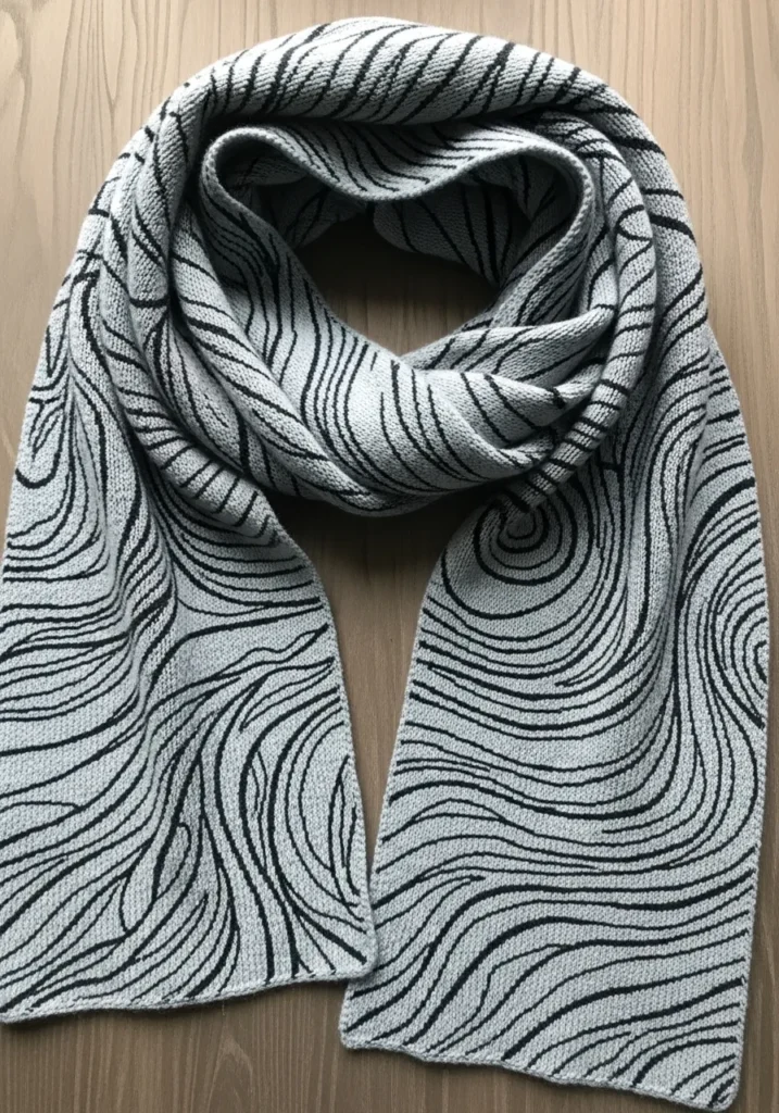 This modern knit scarf features flowing black line patterns layered over a soft light gray base. The lines curve and swirl across the fabric in an organic way, giving the scarf an artsy almost hand drawn look. The knit texture appears smooth and even, with clean edges and a relaxed drape that feels easy to wear. The contrast between the dark lines and pale background keeps it bold but still neutral enough for everyday outfits.