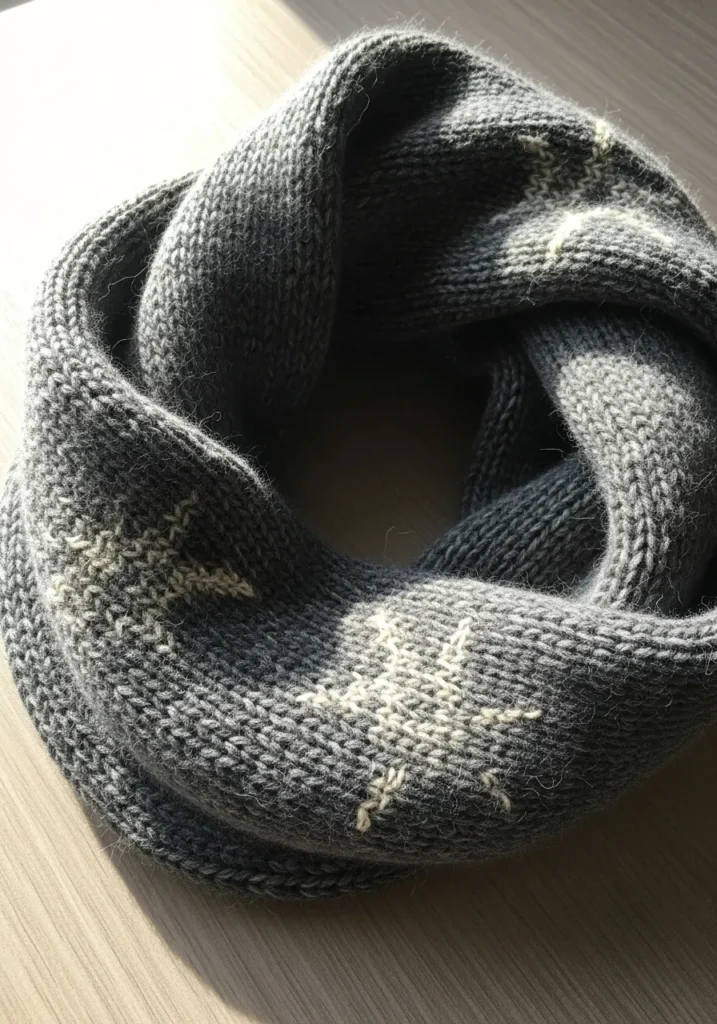 This modern knit infinity scarf features a soft charcoal gray base with small stitched snowflake details in creamy white. The yarn looks warm and slightly fuzzy, giving it that extra cozy texture you want on colder days. The circular shape keeps the design clean and effortless, while the simple snowflake stitches add a quiet seasonal touch without feeling too festive. It feels thick, soft, and perfectly slouchy.