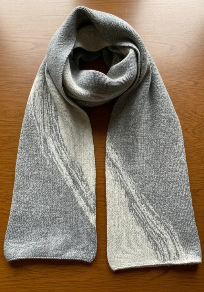 This knit scarf blends gentle shades of gray and cream in a subtle flowing gradient that feels calm and modern. The texture looks smooth and even with a lightweight but cozy drape that sits nicely around the neck. Soft diagonal transitions run through the fabric, giving the design movement without strong contrast. The overall look is minimal and polished, perfect for everyday wear.
