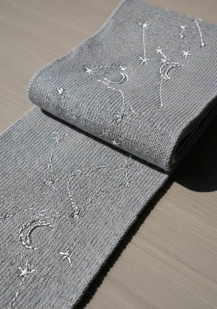 This knit scarf comes in a soft cool gray with fine white stitching that forms tiny stars moons and constellation lines across the fabric. The texture looks smooth and gently structured with a cozy but lightweight feel. The embroidery adds a subtle shimmer and a hand finished look that feels thoughtful and modern. The overall design is calm dreamy and very easy to style.