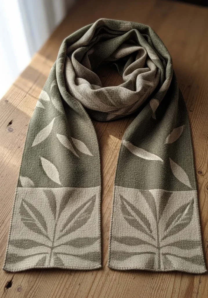 This modern knit scarf features a soft leafy pattern that feels calm and nature inspired without looking too rustic. The fabric blends muted olive green with warm beige, creating a grounded color palette that feels easy to wear. The knit texture looks smooth and cozy with just enough structure to hold the leaf shapes clearly. Laid flat, the scarf shows off its clean edges and gentle drape, giving it a relaxed handmade look that still feels polished.