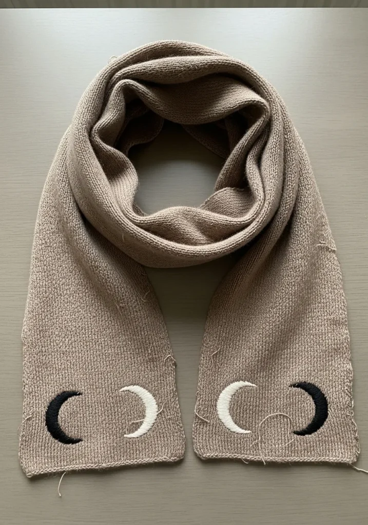 This modern knit scarf keeps things soft and dreamy with its warm taupe base and simple crescent moon embroidery near the ends. The knit texture looks cozy and slightly rustic, with visible stitches and a few loose threads that give it a handmade feel. The black and cream moon shapes add just enough contrast without overpowering the neutral tone, making the overall design feel calm, modern, and easy to style.