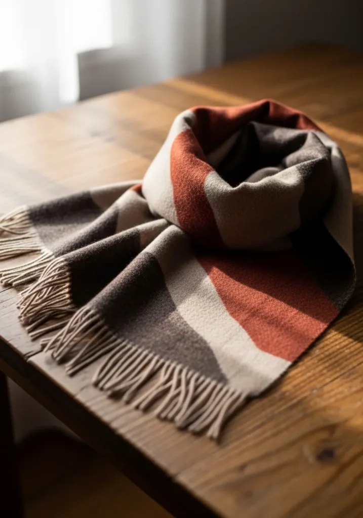 This modern scarf features bold color blocking in cozy shades of rust, cream, and deep brown that feel warm without being heavy. The fabric looks soft and slightly plush, with a smooth surface that drapes easily across the table. Long fringe along the edges adds movement and texture, giving the whole piece a relaxed and effortless finish. The colors blend beautifully while still standing out, making it feel stylish but very wearable.