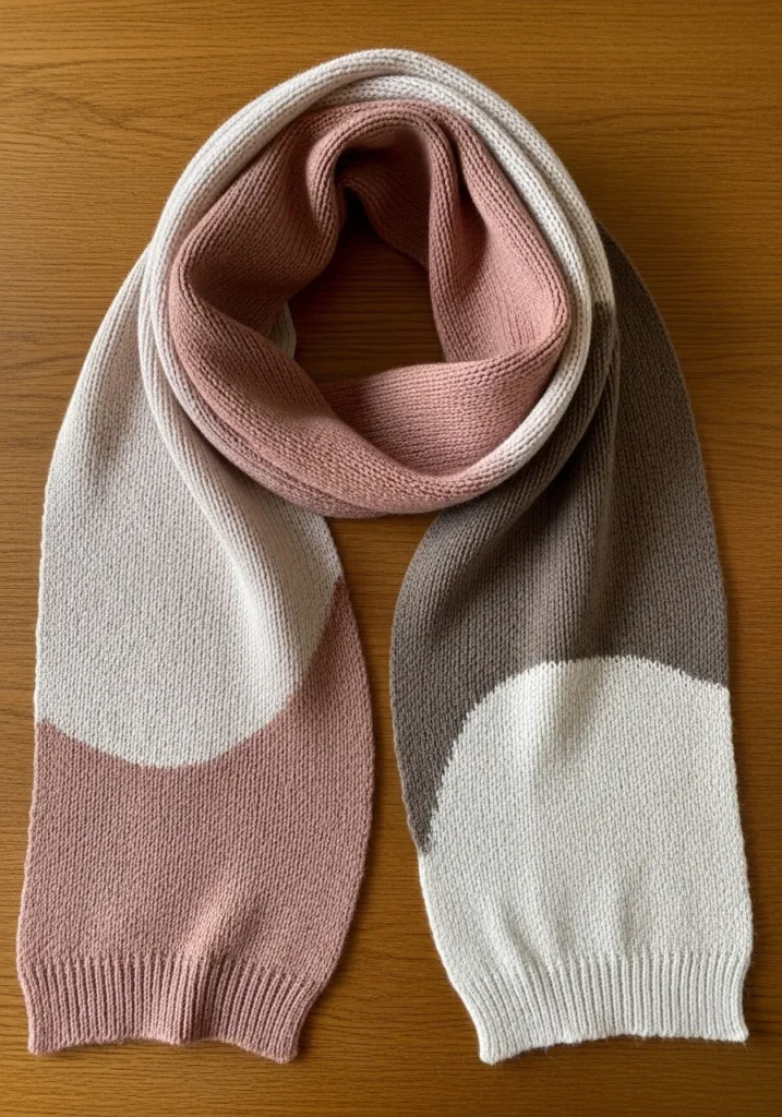 This modern knit scarf plays with gentle color blocking in soft blush pink, warm cream, and muted taupe. The knit texture looks smooth and even, with a cozy medium weight that drapes nicely without feeling bulky. Clean ribbed edges at the ends give it a polished finish, while the rounded color transitions keep the overall look relaxed and contemporary. It feels calm, cozy, and very easy to wear.