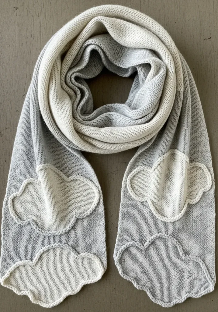 This modern knit scarf features a soft gray and cream color palette with playful cloud shapes stitched onto each end. The knit texture looks smooth and cozy, with slightly raised cloud appliques that add gentle dimension and a handmade feel. The neutral tones keep it calm and wearable, while the rounded cloud edges bring in a subtle whimsical touch. Everything about it feels light, soft, and quietly charming.