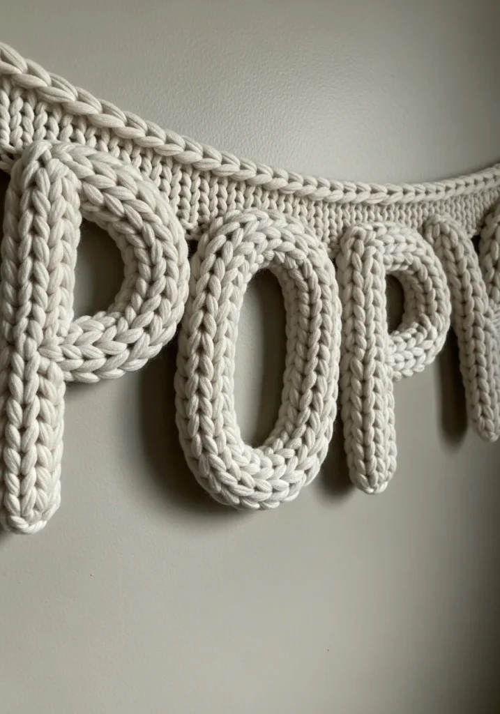 This chunky knit word wall hanging is made with thick creamy white bulky yarn that creates bold rounded letters with lots of texture. Each letter is tightly knit and slightly raised, giving the piece a soft sculptural look against the smooth wall. The stitches are big and clearly defined, which makes the word feel playful and cozy at the same time. The overall design feels clean and modern while still showing off that unmistakable handmade charm.
