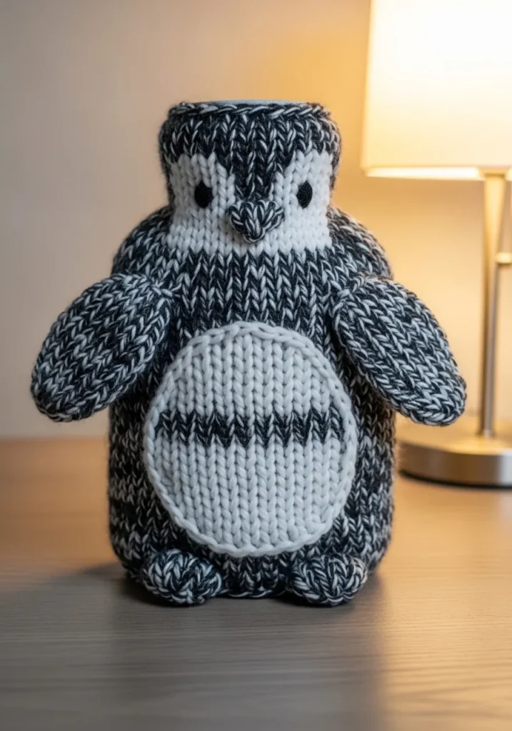 This chunky knit penguin hot water bottle cover is made with thick bulky yarn in classic black white and soft gray tones. The stitches are large and plush, giving it a super cozy feel that also helps insulate the bottle inside. The sweet penguin design features rounded wings, a soft belly panel, and a simple stitched face that adds instant charm. The dense knit keeps its shape well while still feeling squishy and comforting in your hands.