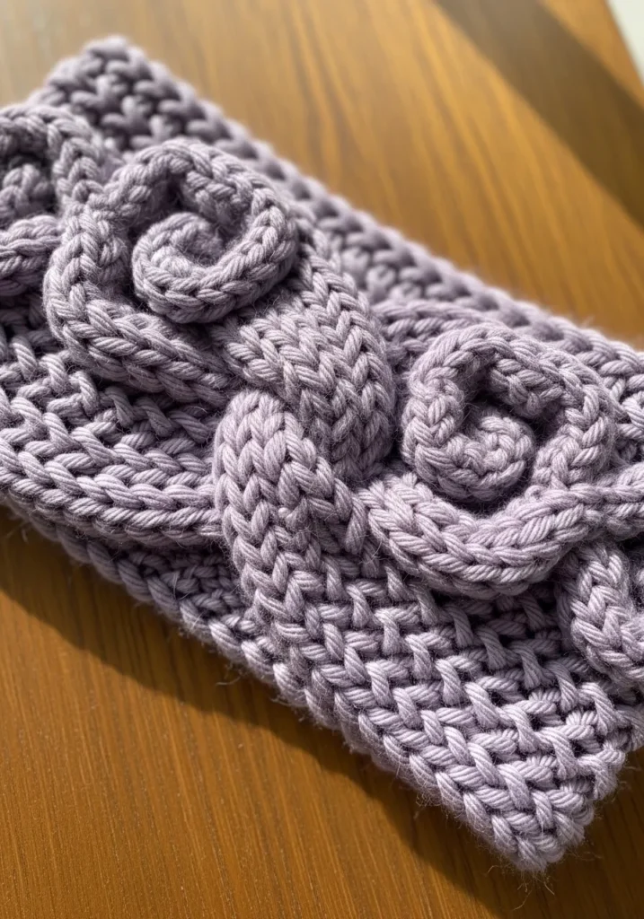 This chunky knit headband is made with thick bulky yarn in a soft muted lavender shade that feels calm and cozy. The design features raised spiral and bobble details that sit on top of a dense knit base, creating lots of visual interest and touchable texture. The stitches are bold and clearly defined, giving the headband a plush feel while still keeping its shape. It looks warm, slightly stretchy, and perfectly imperfect in that lovely handmade way.