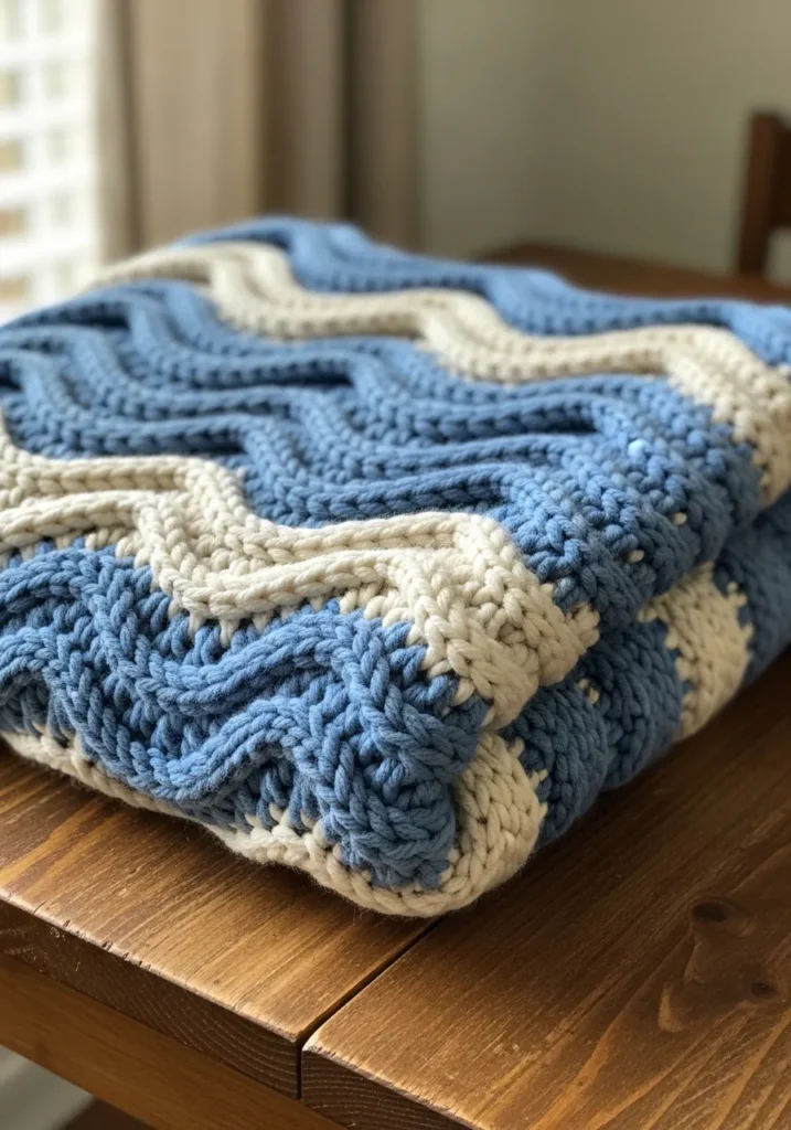 This chunky knit chevron blanket is made with thick bulky yarn in soft denim blue and creamy white tones that feel calm and cozy. The bold zigzag pattern creates deep texture across the surface, with each ridge standing out thanks to the oversized stitches. The blanket looks plush and heavy in the best way, with gently rounded edges and visible stitch definition that really shows off the yarn. It has that inviting drape that makes you want to reach out and wrap yourself up right away.
