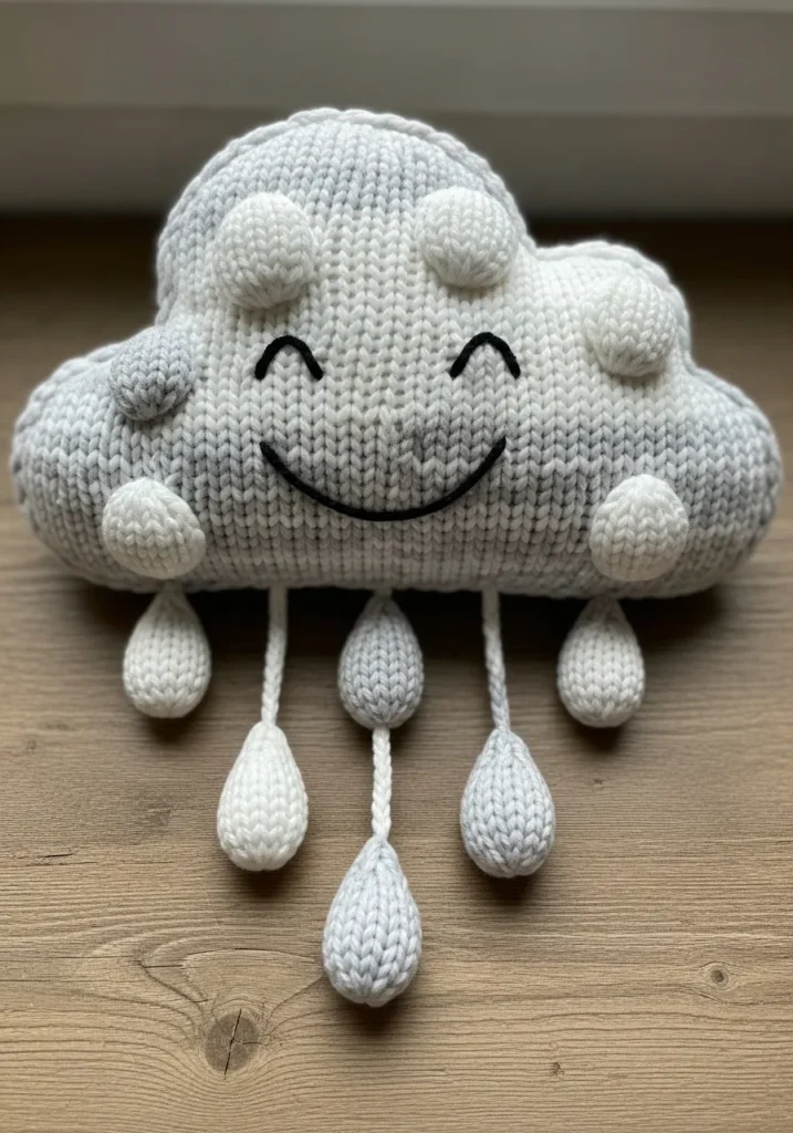 This chunky knit smiling cloud plush is made with soft bulky yarn in gentle shades of white and light gray that feel calm and cozy. The stitches are thick and evenly spaced, giving the cloud a plush rounded shape that looks extra squishy. Raised knit puffs add texture across the surface, and the dangling raindrop details bring a playful touch that makes the design feel full of personality. The simple stitched face ties everything together and keeps the look sweet and friendly.