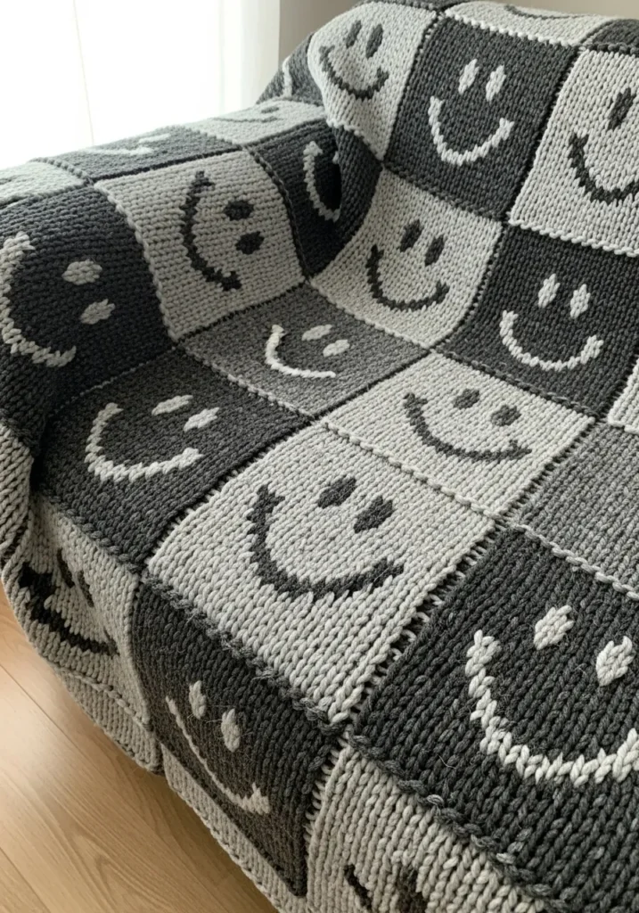 This chunky knit smiley patchwork blanket is made with thick bulky yarn in cozy shades of gray and charcoal. Each square features a simple smiling face that pops against the textured knit background, creating a playful checkerboard look. The stitches are large and clearly defined, giving the blanket a soft but structured feel that drapes beautifully over a chair or sofa. The repeating squares add visual rhythm while the chunky texture keeps it warm and inviting.