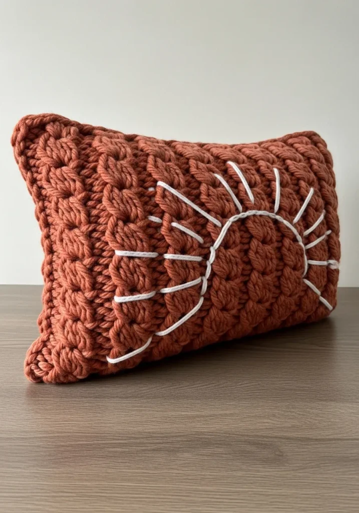 This chunky knit sunburst pillow is made with thick bulky yarn in a warm rust tone that feels earthy and cozy. The surface is packed with big textured stitches that give the pillow a plush and slightly sculpted look. The stitched sunburst detail in soft white yarn adds contrast and draws the eye to the center, giving the design a playful handmade twist. The rectangular shape feels modern while still showing off that bold chunky texture from edge to edge.