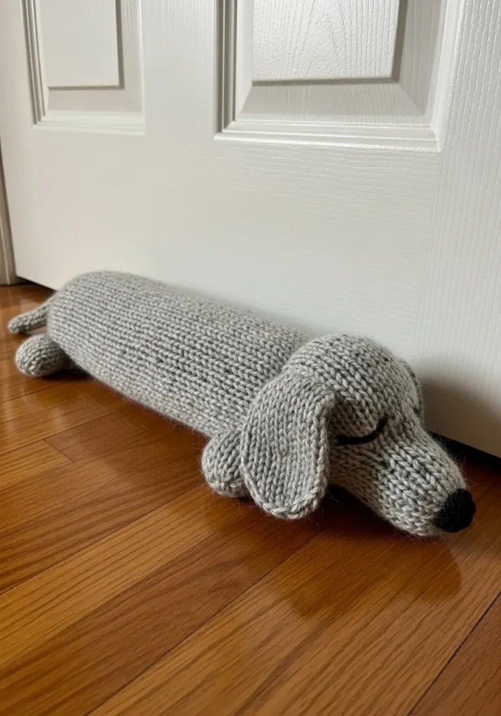 This chunky knit dachshund door stopper is made with thick bulky yarn in a soft gray shade that gives it a cozy and sturdy look. The long body is knit with dense even stitches that create a solid shape, while the floppy ears and tiny legs add sweet character. The simple stitched face keeps it charming and calm, and the chunky texture makes it feel substantial enough to actually do its job. It looks playful yet minimal and fits perfectly into a cozy home setting.
