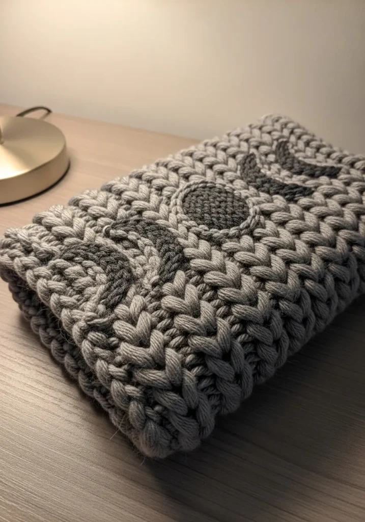 This chunky knit graphic cushion is made with thick bulky yarn in layered shades of gray that give it a modern cozy vibe. The tightly packed stitches create a dense textured surface, while the raised circular shapes add subtle dimension without overpowering the design. The color contrast feels calm and neutral, making the pattern stand out through texture rather than bold color. It has a solid structured look that feels both soft and sturdy at the same time.