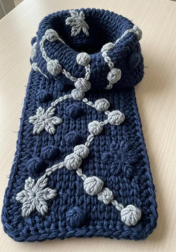 This chunky knit scarf features rich navy bulky yarn paired with soft light gray accents that really pop against the textured background. The fabric is thick and cozy with raised bobble stitches scattered throughout, plus braided lines that guide the eye across the design. The knitted flowers add a sweet handmade touch and give the scarf a playful personality. The wide shape and plush stitches make it feel warm and substantial, perfect for showing off that big texture look.