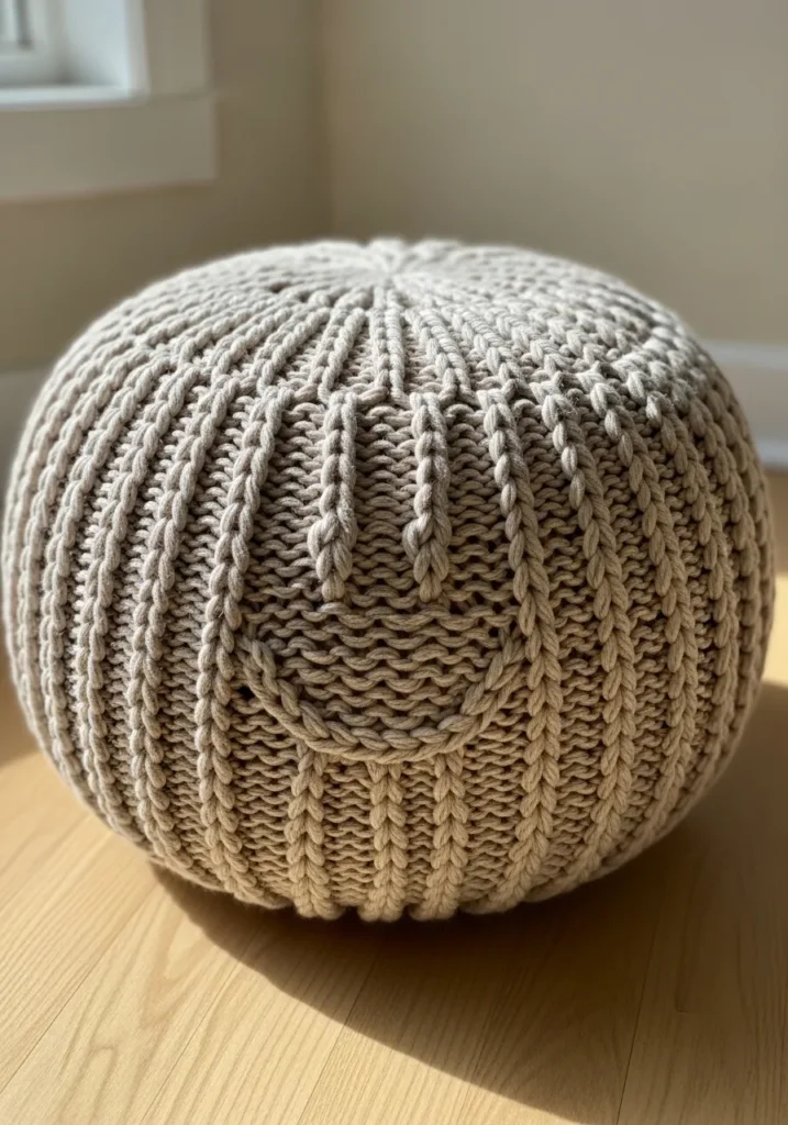 This chunky ribbed knit pouf is a beautiful example of how bulky yarn can turn simple stitches into a real statement piece. The thick neutral beige yarn creates deep vertical ribs that wrap around the entire pouf, giving it a clean yet cozy look. The rounded shape feels sturdy and soft at the same time, and the subtle texture changes between the ribbing and smoother knit sections add quiet visual interest. It looks heavy, plush, and perfectly imperfect in that handmade way that makes knit decor so inviting.