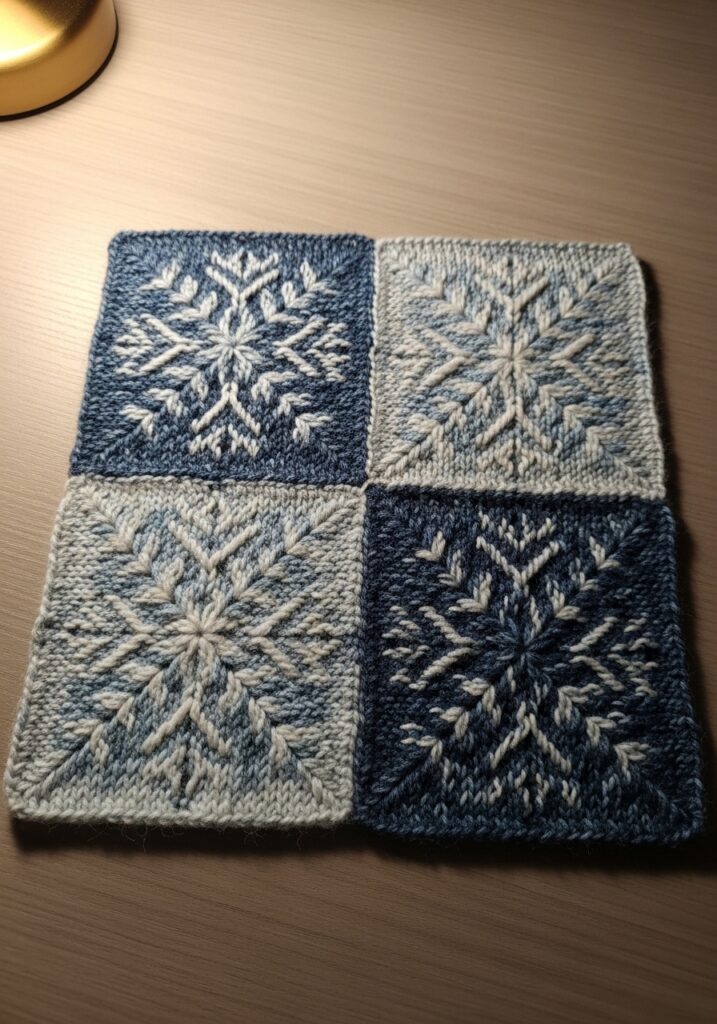 This four-square knitted sampler is giving full winter wonderland energy and I am completely here for every single stitch of it. Each square features a large intricate snowflake motif worked in creamy white against a beautifully marled blue background, with the blue shades alternating between a deeper denim tone and a softer silvery grey blue across the four squares, creating a gorgeous checkerboard effect when they are joined together. The snowflake designs are bold and detailed with branching arms and decorative tips that fill each square almost completely, giving the whole piece a rich and elaborate look that feels very Nordic and cozy. The yarn has a lovely tweedy, marled quality that adds extra depth and warmth to the colorwork, making the whole sampler feel like something you would find in a boutique Scandinavian gift shop.
