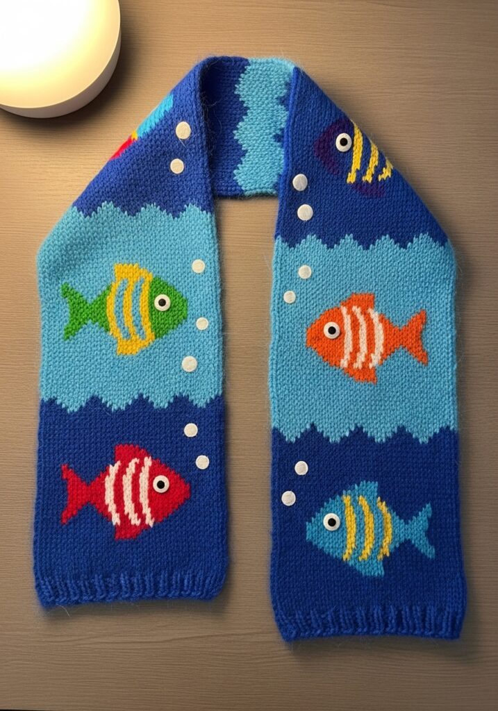 I think this scarf is such a brilliant project because it uses intarsia colorwork to create those individual fish shapes, which is a technique that sounds fancy but is actually a really fun and creative way to add bold picture motifs to knitting without carrying yarn all the way across the back. Every fish is its own little colorwork adventure and you can totally customize the colors to suit the child you are making it for. I love that this is a project with a real story built into it, and kids are so much more likely to actually wear a scarf when it looks this fun and playful. It is a genuinely joyful make from start to finish.
