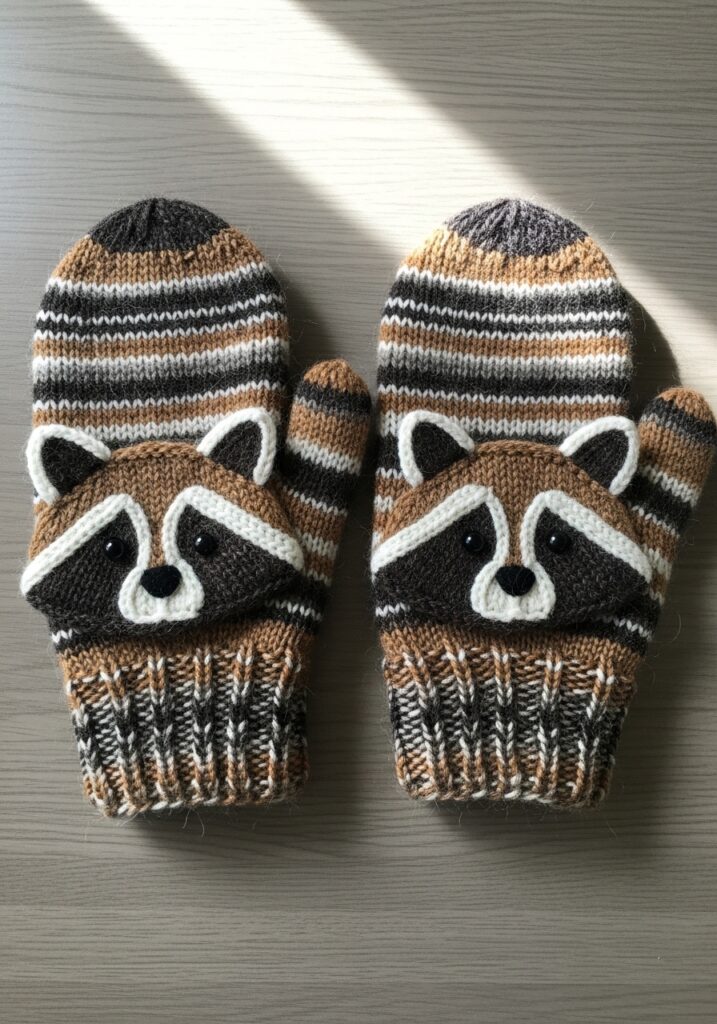 These raccoon mittens are so unbelievably charming that I genuinely audibly gasped when I first saw them, and I stand by that reaction completely. The mitten body is knitted in a multi-stripe pattern that cycles through warm caramel brown, dark charcoal grey, and crisp white in thin repeating horizontal bands, giving the whole mitten a really fun and lively woodland creature energy even before you get to the face. The star of the show is the three dimensional raccoon face appliqué sitting right in the middle of each mitten, featuring a dark grey mask, a soft brown forehead, a white muzzle area, tiny rounded ears with white inner detail, and two shiny black bead eyes that give each little raccoon the most mischievous and endearing expression imaginable. The stripes continue through the chunky ribbed cuff at the wrist, tying the whole design together beautifully from top to bottom.