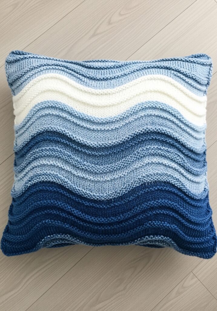 This cushion cover looks like someone captured the most serene stretch of ocean and turned it into the coziest home accessory imaginable, and I am completely here for that energy. It is knitted in a beautiful ripple or wave stitch pattern that creates smooth undulating rows flowing across the entire surface of the cushion, mimicking the gentle rhythm of rolling ocean waves in the most satisfying way. The color palette is a dreamy ombre arrangement moving from deep navy blue at the bottom through mid denim blue and soft powder blue in the middle, finishing with a single stripe of crisp cream white near the top before transitioning back into the lighter blues, giving the whole piece the feeling of a sun-kissed horizon over calm water. The wave texture itself has a lovely dimensional quality with raised crests and gentle valleys that catch the light beautifully and make the cushion look incredibly lush and inviting.