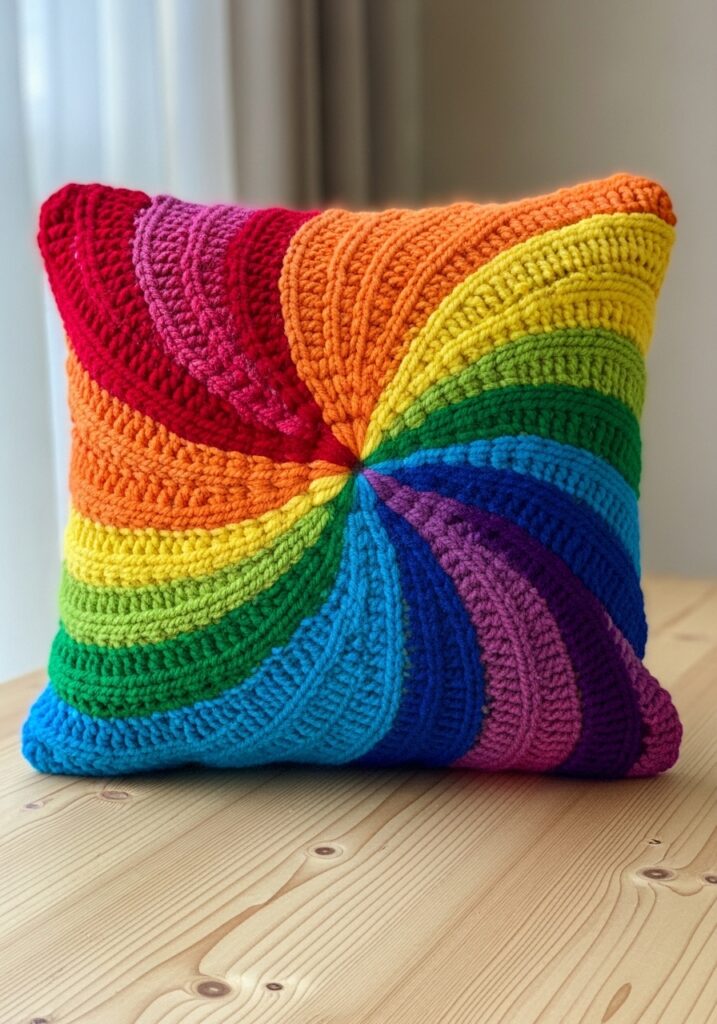 I will not pretend this is a quick weekend project because a cushion this spectacular takes real commitment, but every single round you complete on this is deeply satisfying in a way that few knitting projects manage to achieve. The pinwheel construction means you are working wedge shaped sections that build the swirl shape naturally as you go, and watching those rainbow colors spin into existence is genuinely thrilling from start to finish. I love that this cushion would work as a bold statement piece in literally any room and would bring an instant burst of joy and color to any space it lands in. If you are ready to make the most show-stopping cushion of your crafting life, this rainbow pinwheel is absolutely the one to attempt.