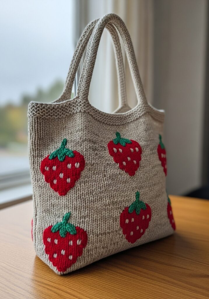 I am completely smitten with this bag because it takes the intarsia colorwork technique and applies it to the most joyful possible subject matter, and strawberries on a knitted bag just never get old. Each strawberry motif is worked individually using small separate bobbins of red yarn, which is exactly how intarsia is meant to be done, and once you get the hang of managing those little yarn sections the whole process becomes surprisingly smooth and enjoyable. I love that the neutral grey background makes the red berries look so vivid and fresh, and this bag would be absolutely perfect for summer outings, farmers markets, or just adding a little fruit-forward fun to an ordinary Tuesday.